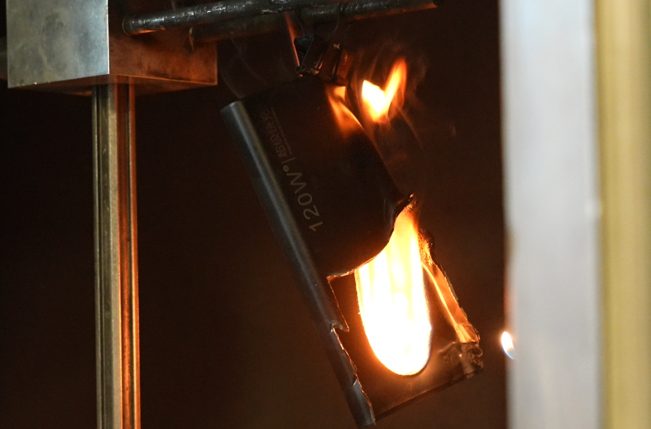 实验室工作人员:火焰应该在30秒内熄灭才算通过,按照要求外壳不能燃尽。而且还有滴落物。