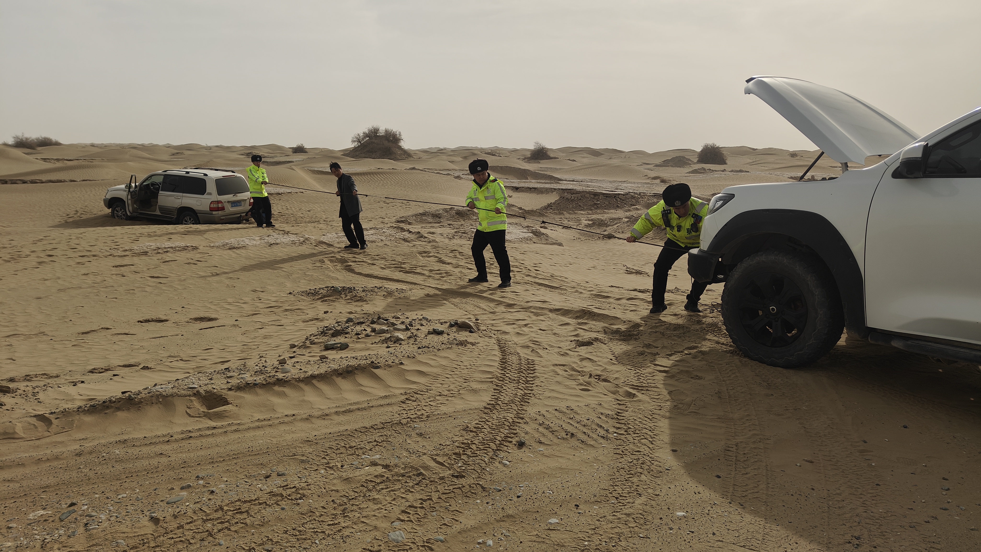 “在沙漠里像这样因为车轮被沙陷打滑的、行驶过程中没油没电的,各种需要救援的情况隔三岔五都会出现。”耿俊俊说着,又和民警索国伟继续上路巡逻了。