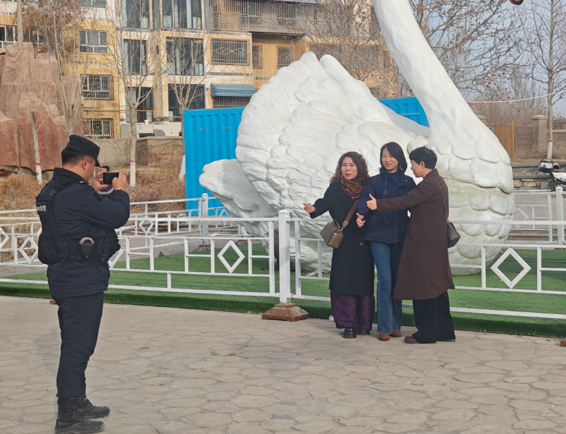 据统计,春节期间,仅在孔雀河景观带和天鹅河景区,执勤的特警队员平均每天为游客拍摄合照达90余张。因为拍得多、拍得耐心,游客们纷纷笑着竖起大拇指,称他们是景区的“拍照主理人”。在一次次按快门的间隙,他们还不忘轻声叮嘱游客注意脚下安全、拿好随身物品。