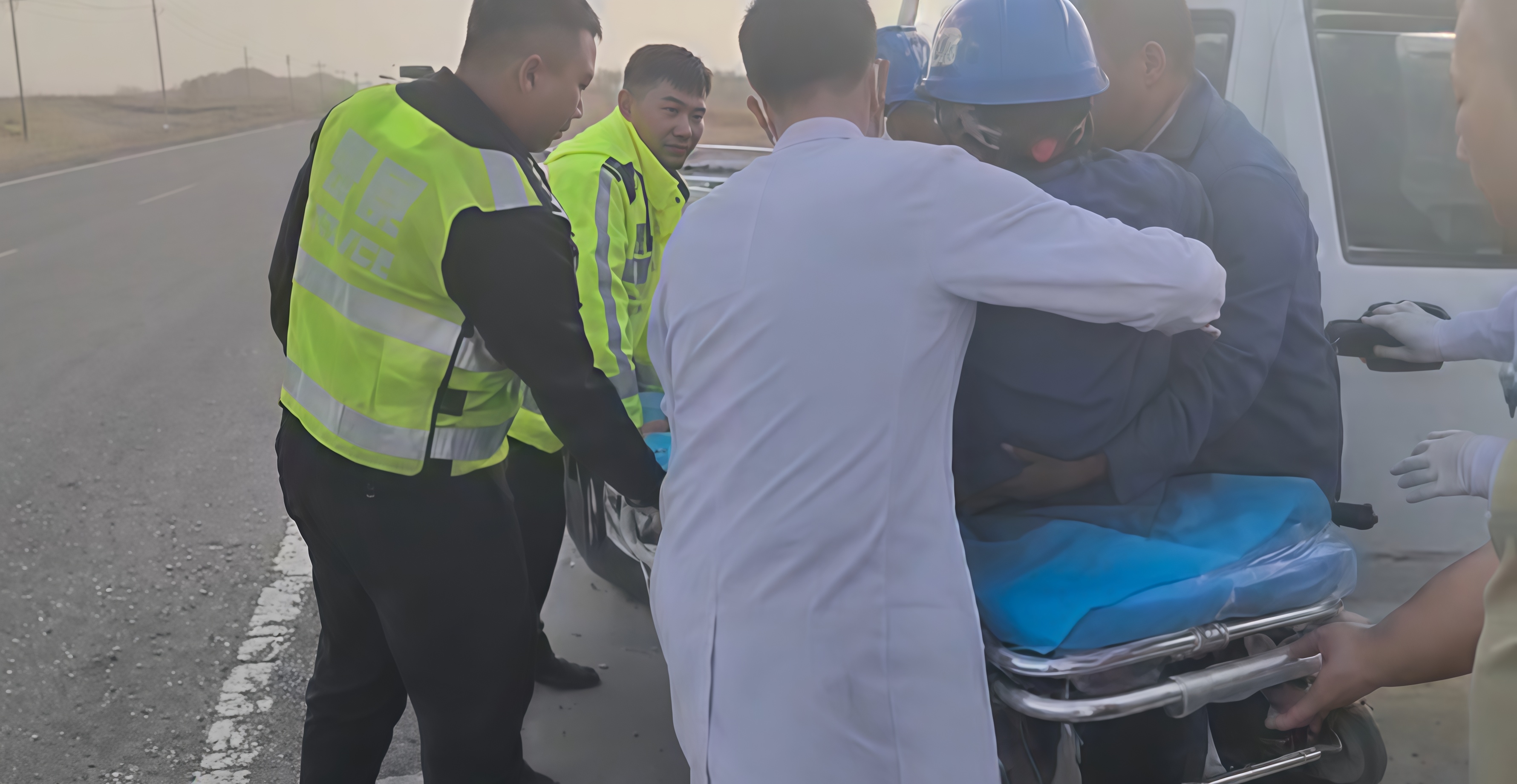经询问得知,该男子在工作过程中不慎摔伤膝盖,伤口较深、出血量大,急需专业医疗处理。由于工地位置偏远,周边无过往车辆,伤者无法自行前往医院,只能在路边无助等待。