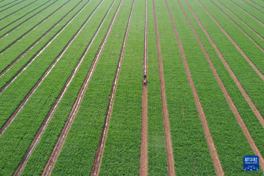 4月9日,在山东省淄博市高青县花沟镇,农民管护冬小麦。新华社发(张维堂摄)