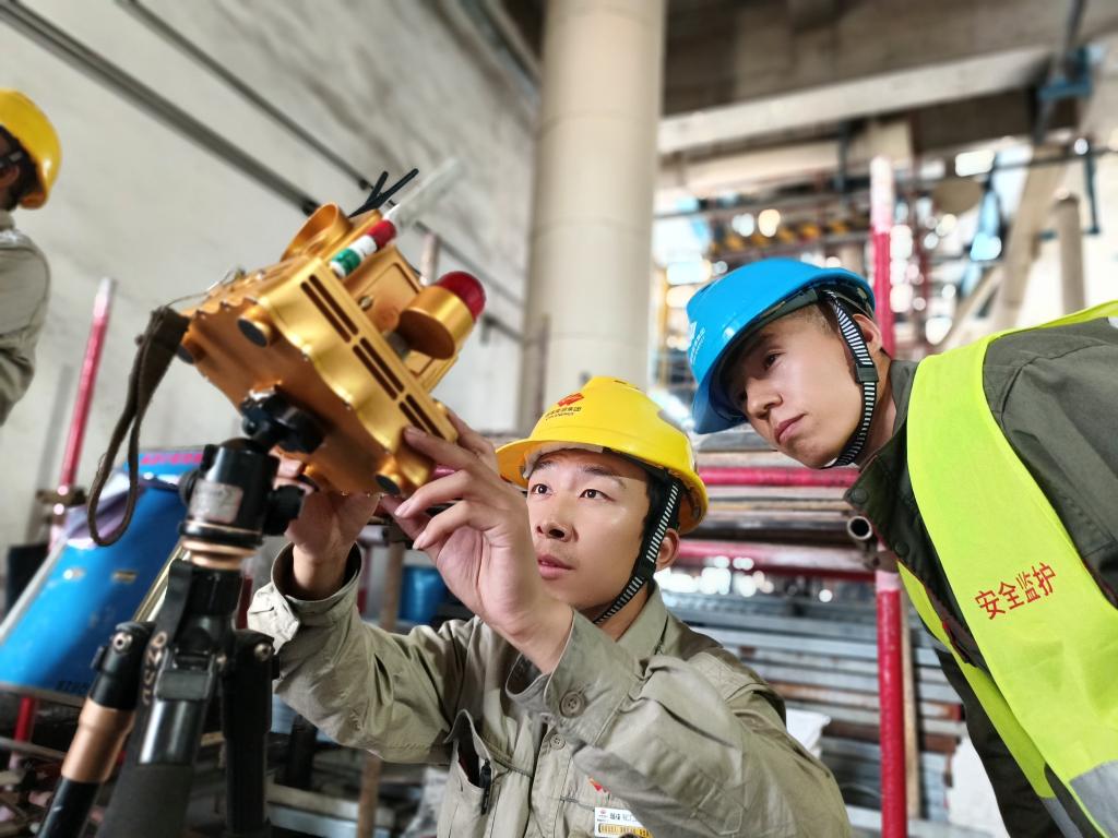 2024年4月23日,中国核电工程有限公司的企业导师和项目负责人现场指导朱澳(左一)。(李海萁 摄)