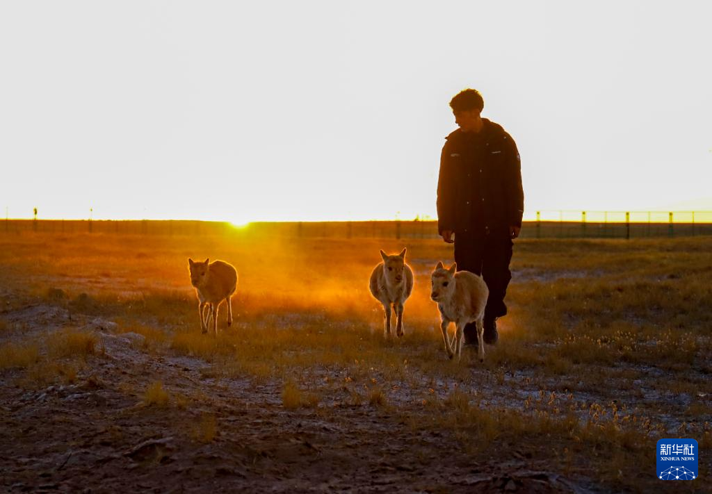 2025年8月27日拍摄的羌塘国家级自然保护区那曲地区管理局尼玛县玛依管护站野生动物专业管护队员罗布与站里收养的藏羚羊幼崽。新华社发