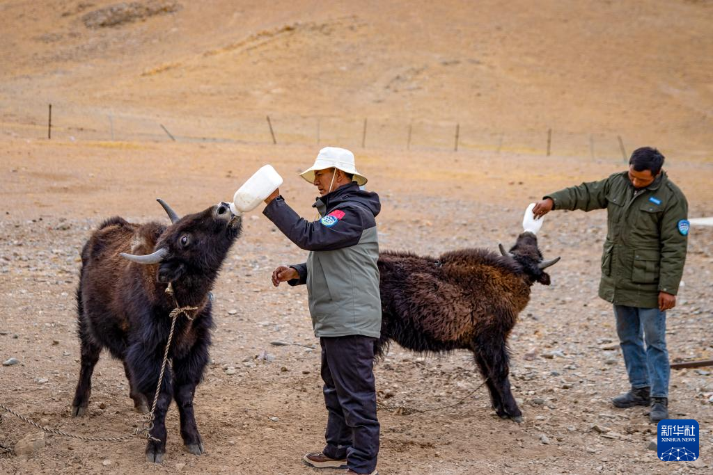 4月8日,羌塘国家级自然保护区那曲地区管理局野生动物专业管护员罗布(左)和同事在给收养的小野牦牛喂奶。新华社记者 姜帆 摄