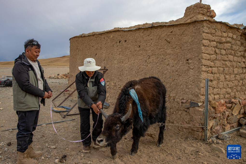 4月8日,羌塘国家级自然保护区那曲地区管理局野生动物专业管护员格桑伦珠(左)和罗布在尼玛县玛依野生动物管护站测量收养的小野牦牛“尕尕”的身体数据。新华社记者 姜帆 摄