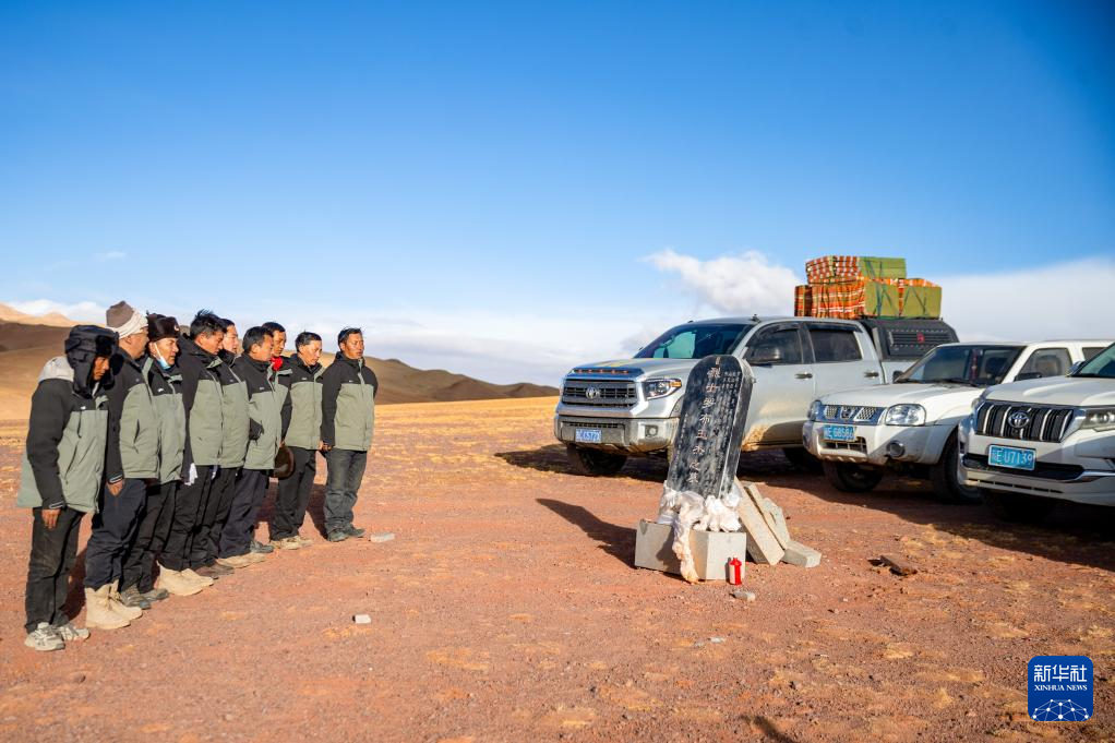 4月8日,即将进入“无人区”进行巡护的羌塘国家级自然保护区那曲地区管理局野生动物专业管护员们按惯例在罗布玉杰烈士墓前默哀致敬。罗布玉杰2002年在与盗猎分子的枪战中牺牲。新华社记者 姜帆 摄