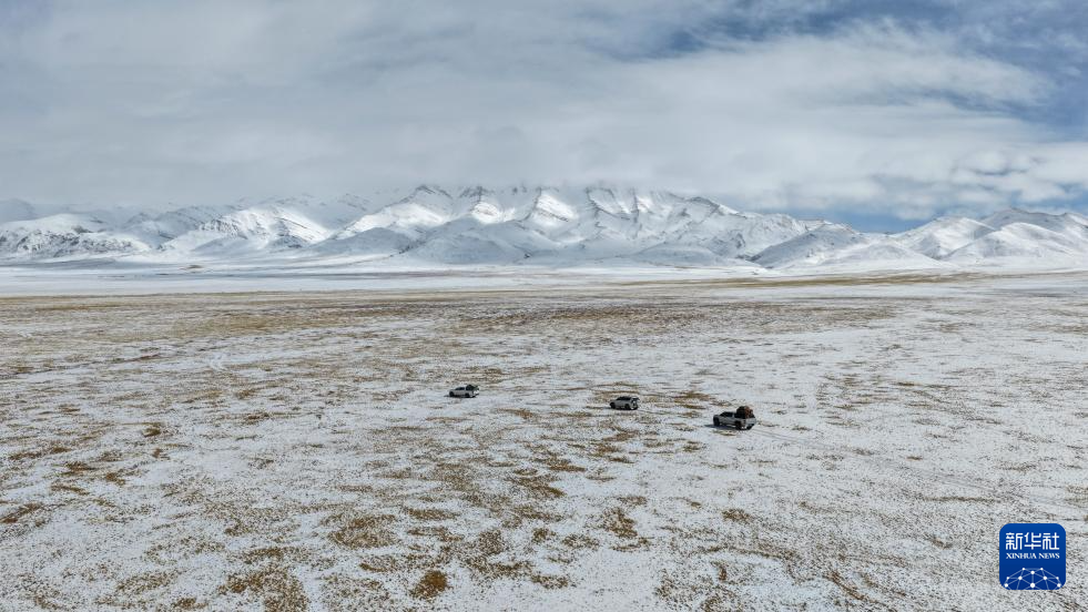 4月9日,羌塘国家级自然保护区那曲地区管理局的巡护队伍在雪中穿越崎岖地貌(无人机照片)。新华社发(梁春宁 摄)