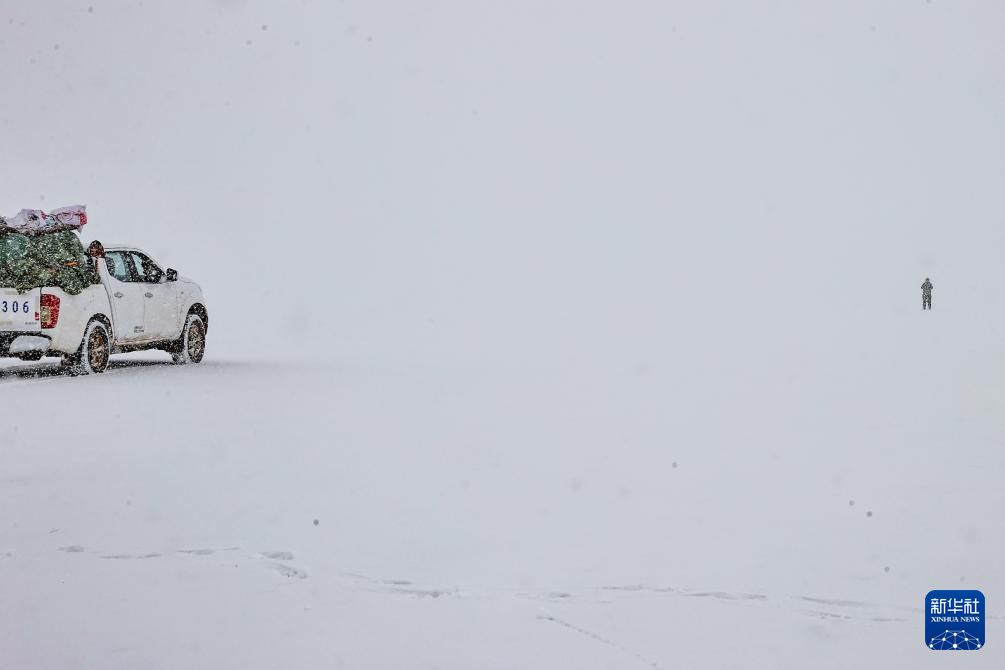4月9日,在巡护途中遇到暴雪,羌塘国家级自然保护区那曲地区管理局野生动物专业管护员格桑伦珠徒步为车队勘察安全线路。新华社记者 姜帆 摄