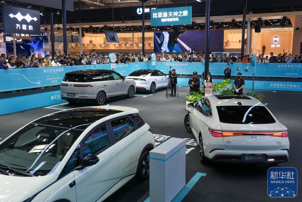 ↑ 4月26日,在2026北京车展上,参观者在参观比亚迪辅助驾驶系统的自主泊车展示。