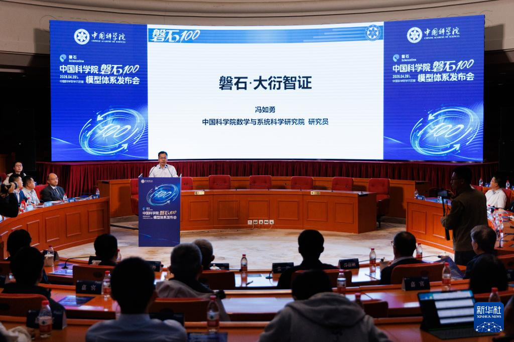 4月28日,在发布会现场,中国科学院数学与系统科学研究院冯如勇研究员发布“磐石·大衍智证”大模型。新华社记者 金立旺 摄