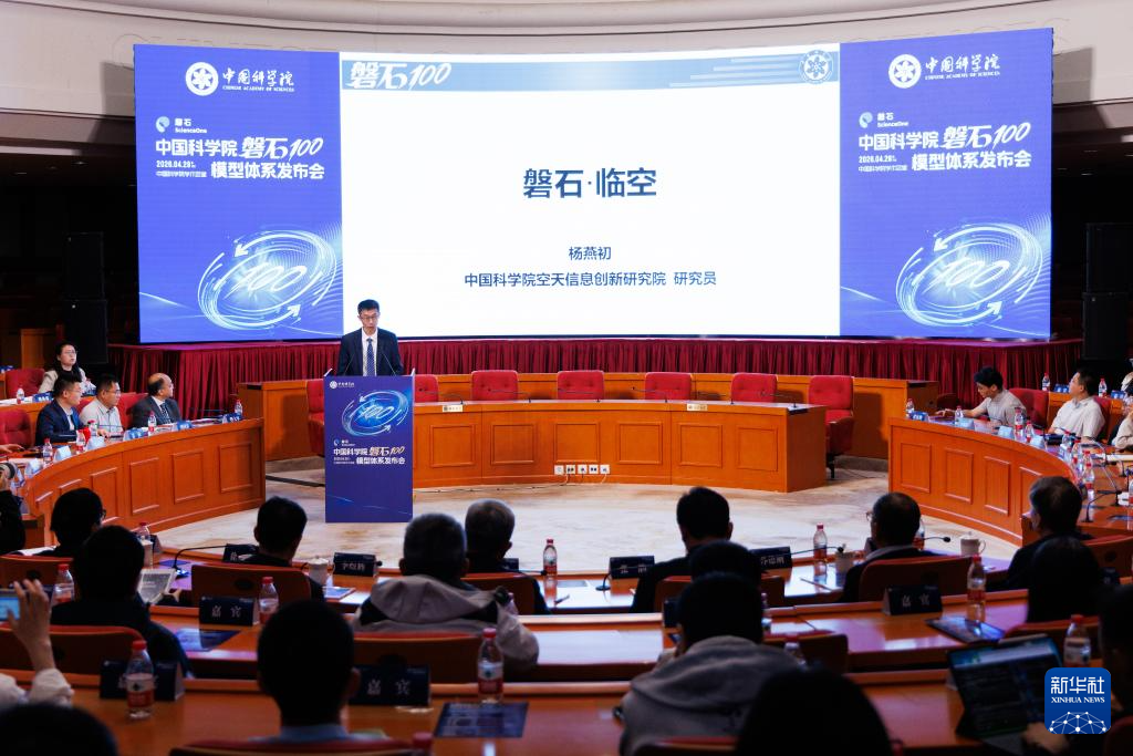 4月28日,在发布会现场,中国科学院空天信息创新研究院杨燕初研究员发布“磐石·临空”大模型。新华社记者 金立旺 摄