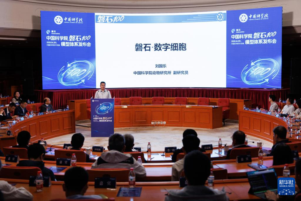 4月28日,在发布会现场,中国科学院动物研究所刘国乐副研究员发布“磐石·数字细胞”大模型。新华社记者 金立旺 摄