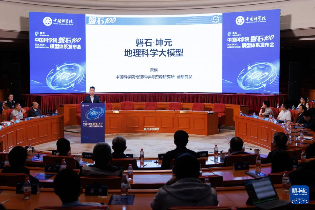 4月28日,在发布会现场,中国科学院地理科学与资源研究所姜侯副研究员发布“磐石·坤元”大模型。新华社记者 金立旺 摄