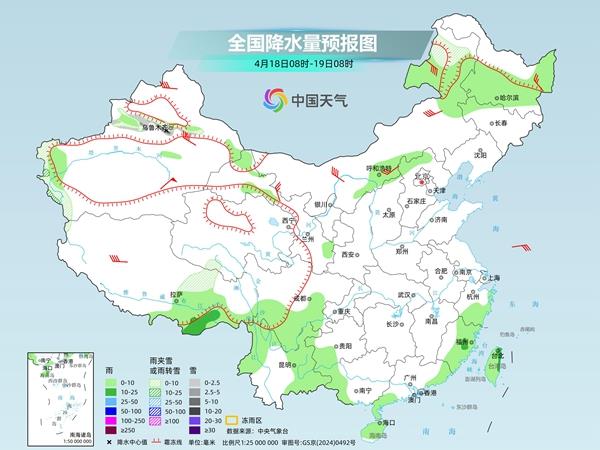 明天,内蒙古东北部、黑龙江西北部、新疆南疆西部山区、西藏西北部等地部分地区有小到中雪或雨夹雪,其中,内蒙古东北部、黑龙江西北部等地部分地区有大到暴雪;黑龙江中部、黄淮中部,西南地区东部、湖北西南部、湖南西部、广西等地部分地区有中到大雨,其中,重庆中西部、贵州中部和东北部、湖南西部、广西西北部等地部分地区有暴雨或大暴雨。