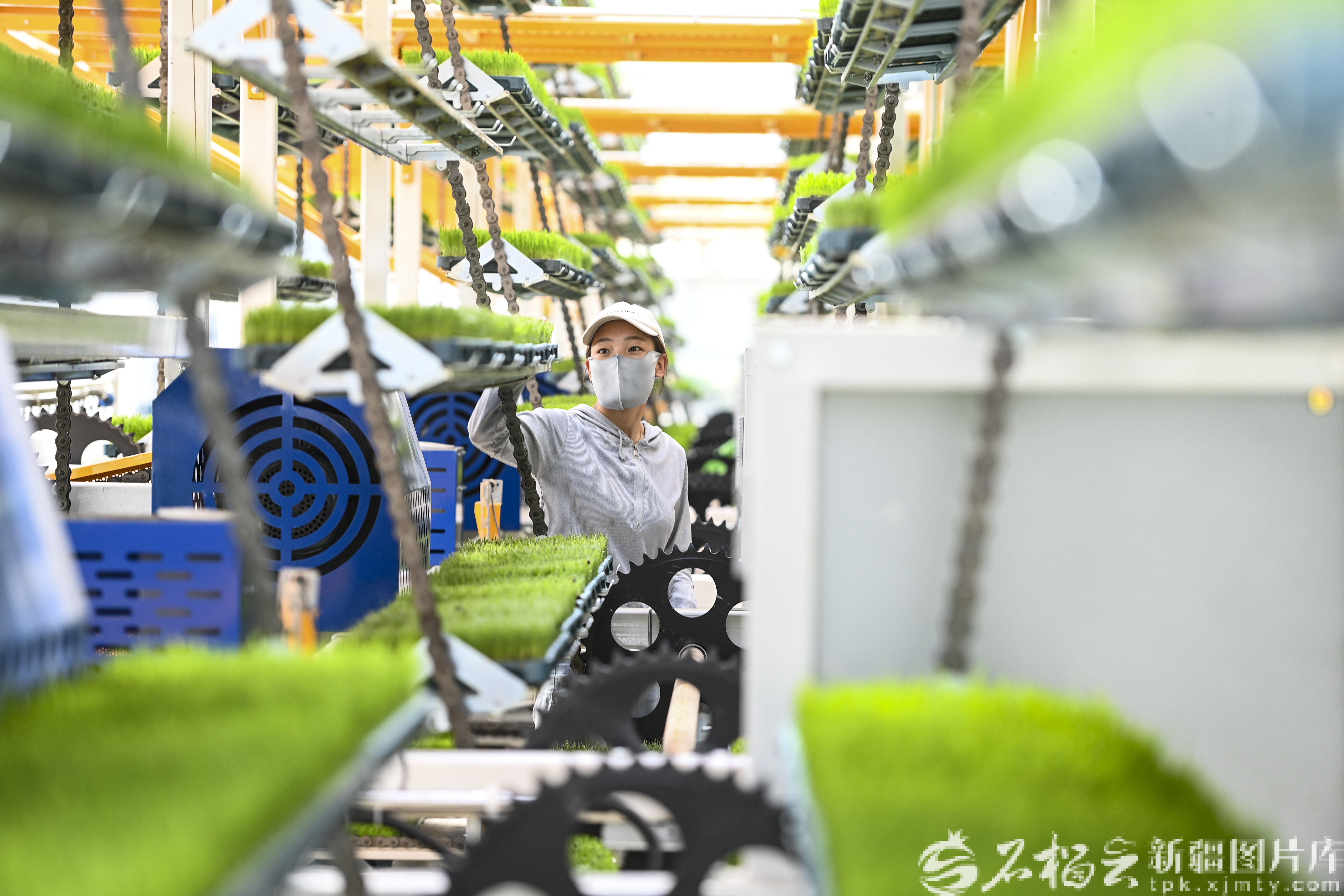 4月16日,在乌鲁木齐市米东区羊毛工镇育秧工厂,立体育秧设备有序运转,秧苗长势喜人。