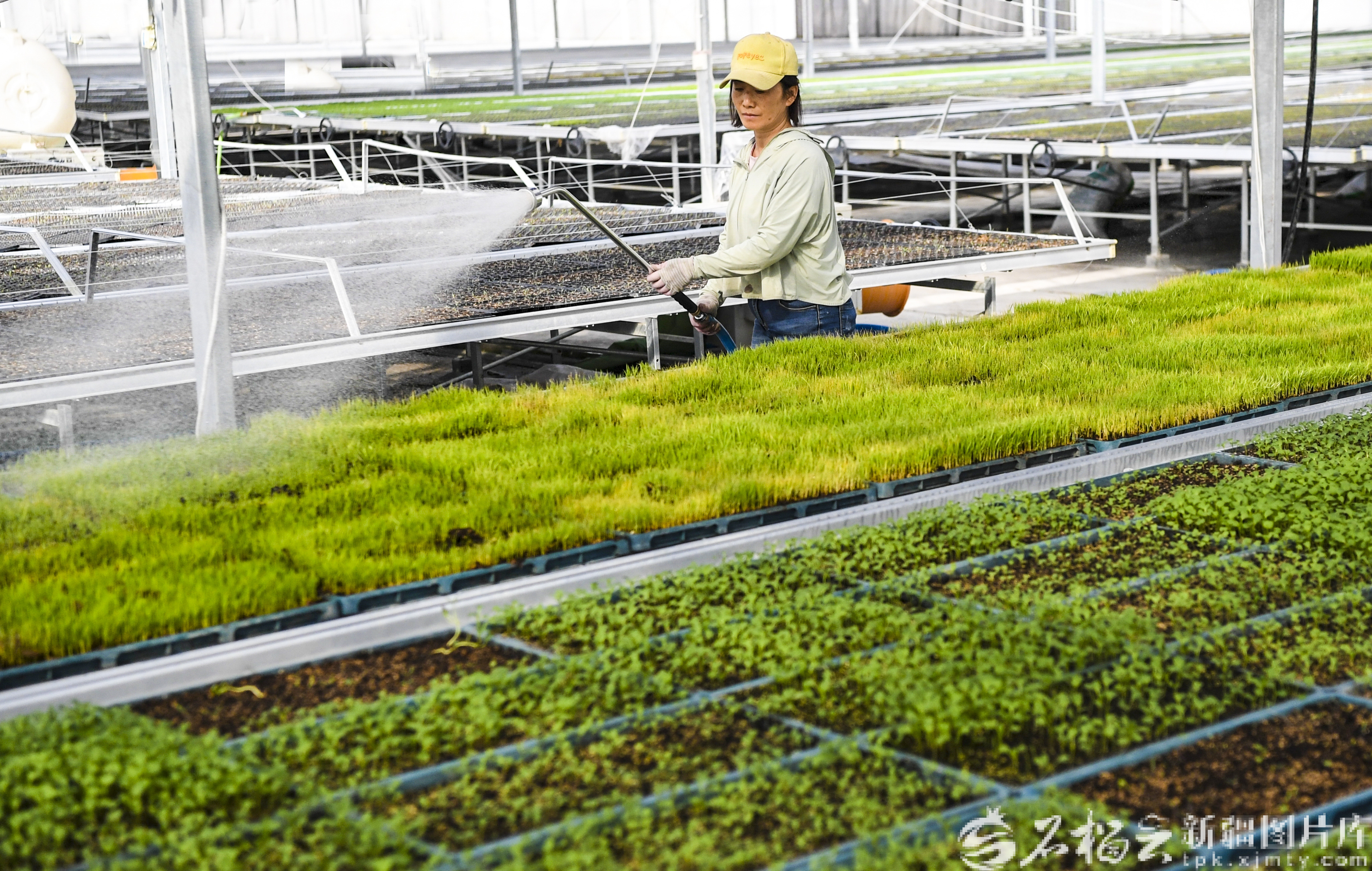 4月16日,在乌鲁木齐市米东区羊毛工镇育秧工厂,工人喷淋浇灌水稻秧苗。