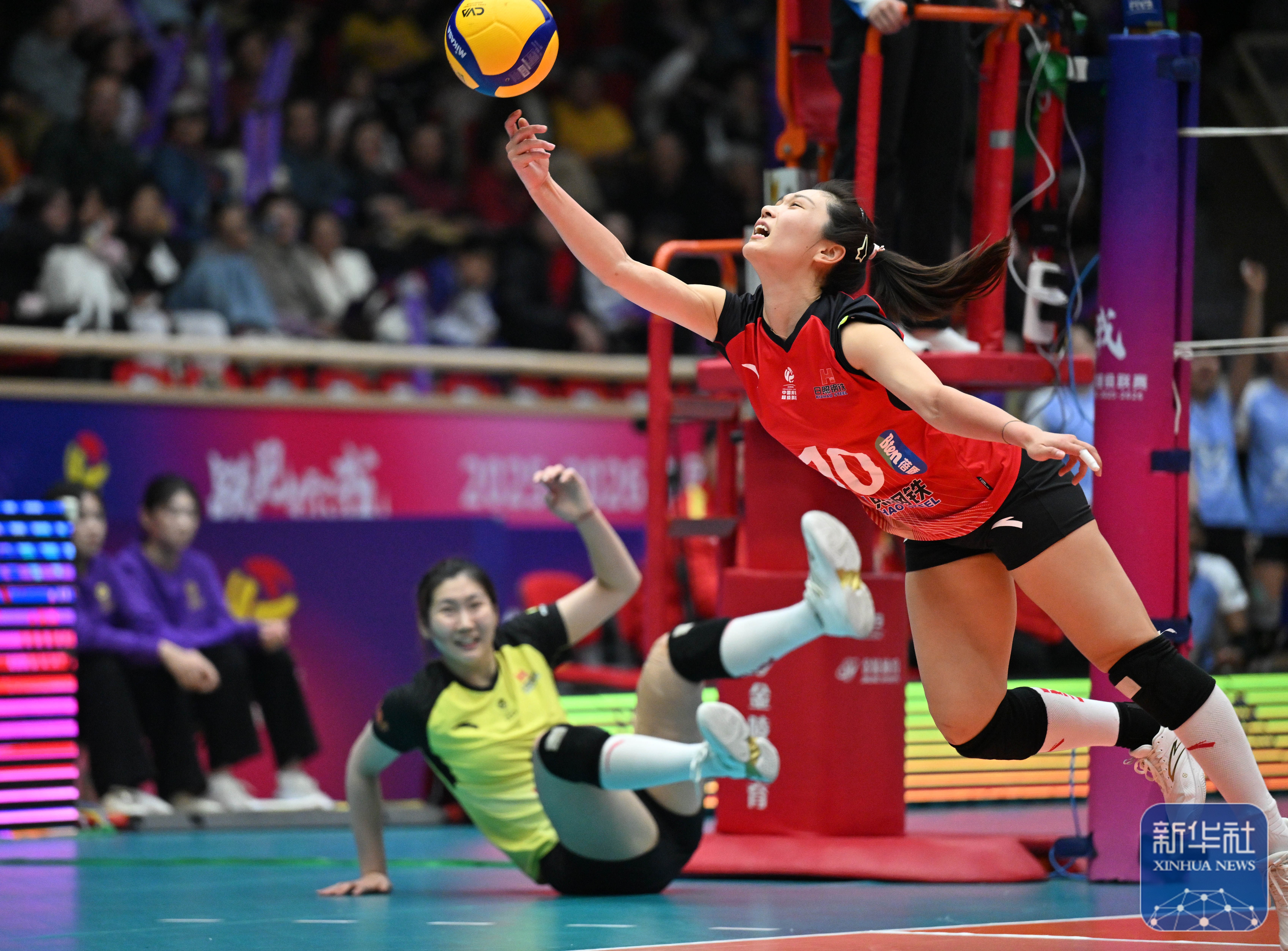 ↑ 山东日照钢铁队球员郭湘玲(右)在比赛中扣球。