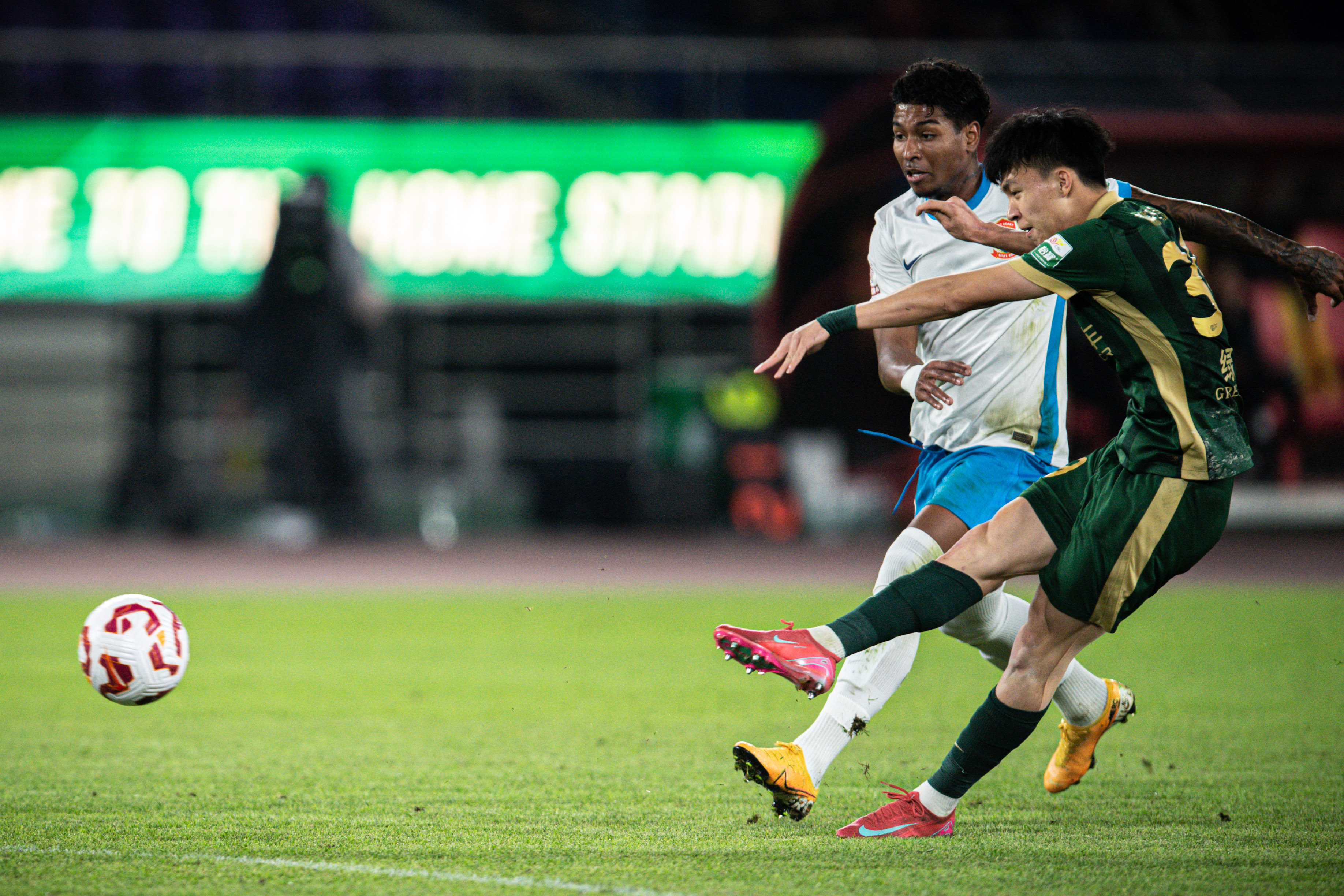 2025年4月27日,浙江队球员王钰栋(右)在比赛中射门。当日,在2025赛季中国足球超级联赛第九轮比赛中,浙江队主场2比1战胜青岛西海岸队。新华社记者 江汉 摄