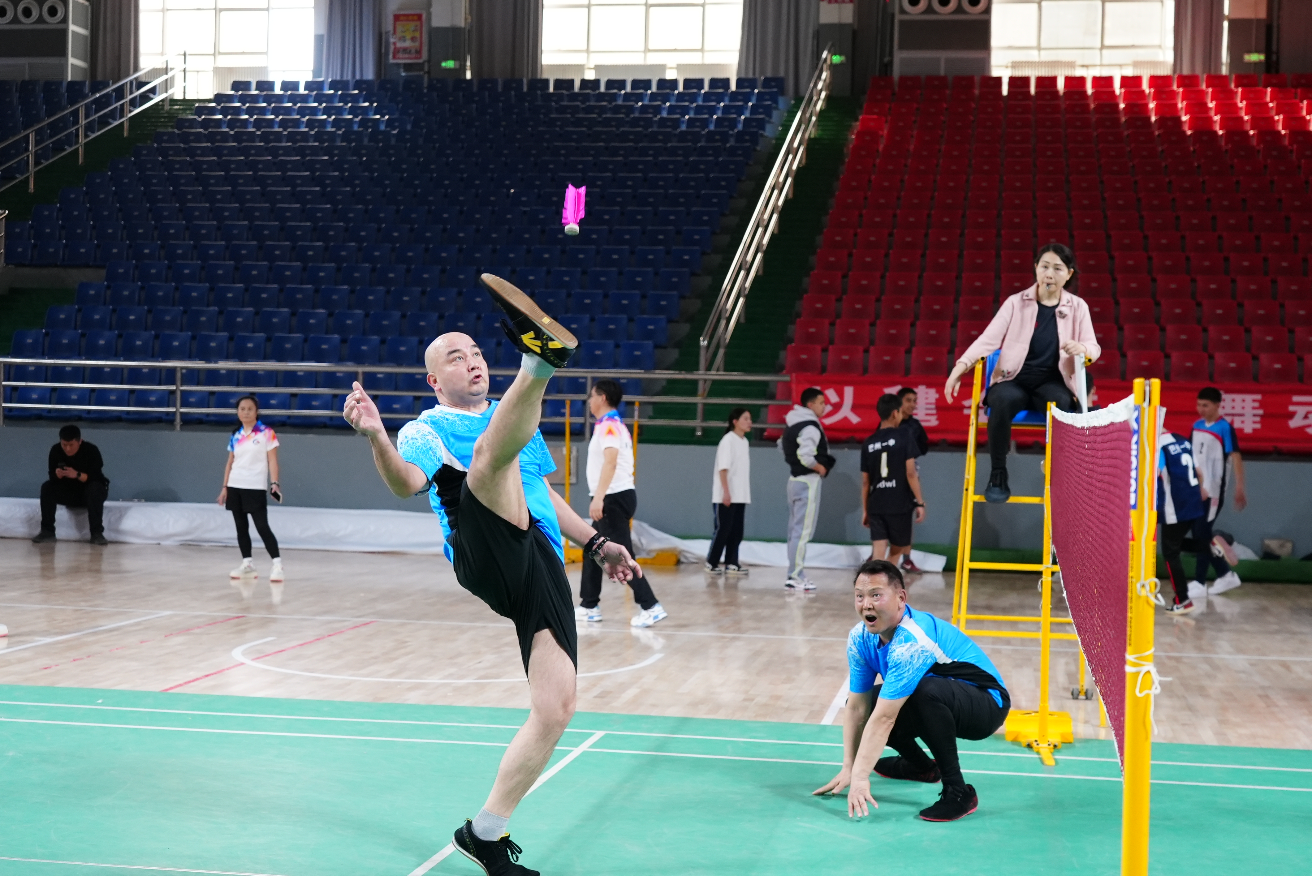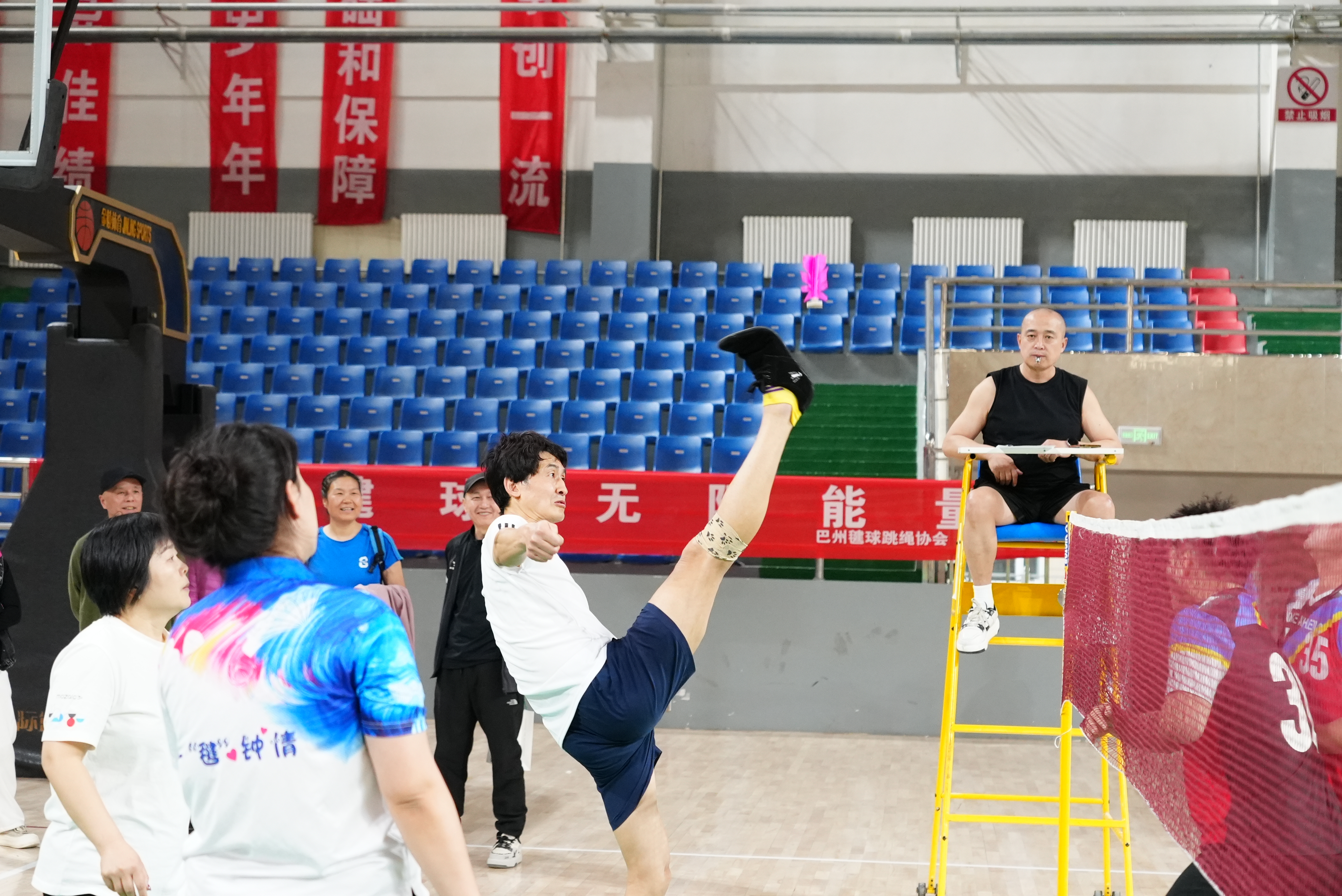 网式毽球赛场战况激烈,选手们隔网对峙,脚尖轻点挑球、脚背弹击送球、膝盖稳托卸力、侧身凌空倒钩,时而后场大力扣杀,时而前场轻巧吊球,小小毽球在空中来回穿梭,对阵双方斗智斗勇、攻防有序,利落招式轮番上演,场面扣人心弦。