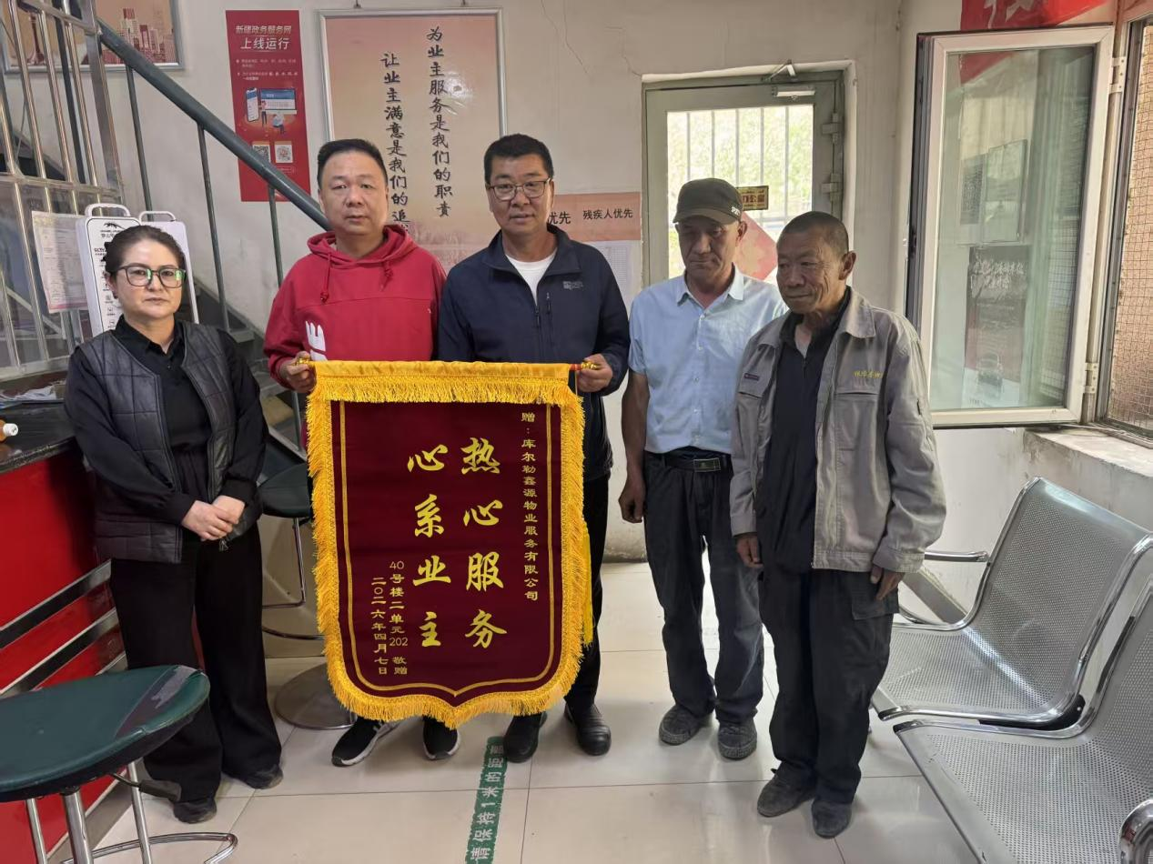 4月17日,库尔勒市朝阳街道华夏名门小区的物业服务企业收到小区业主送来的一面鲜红锦旗。