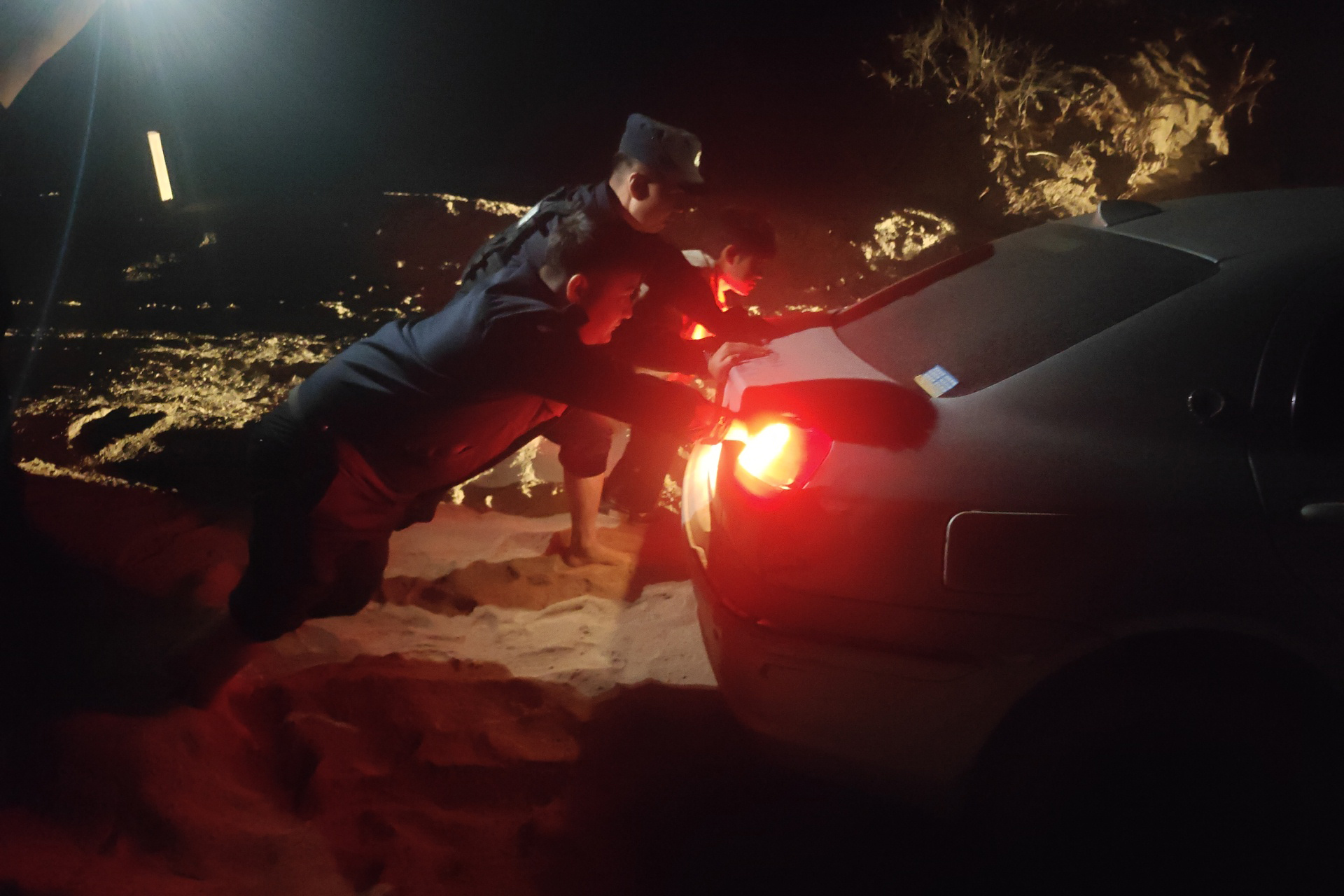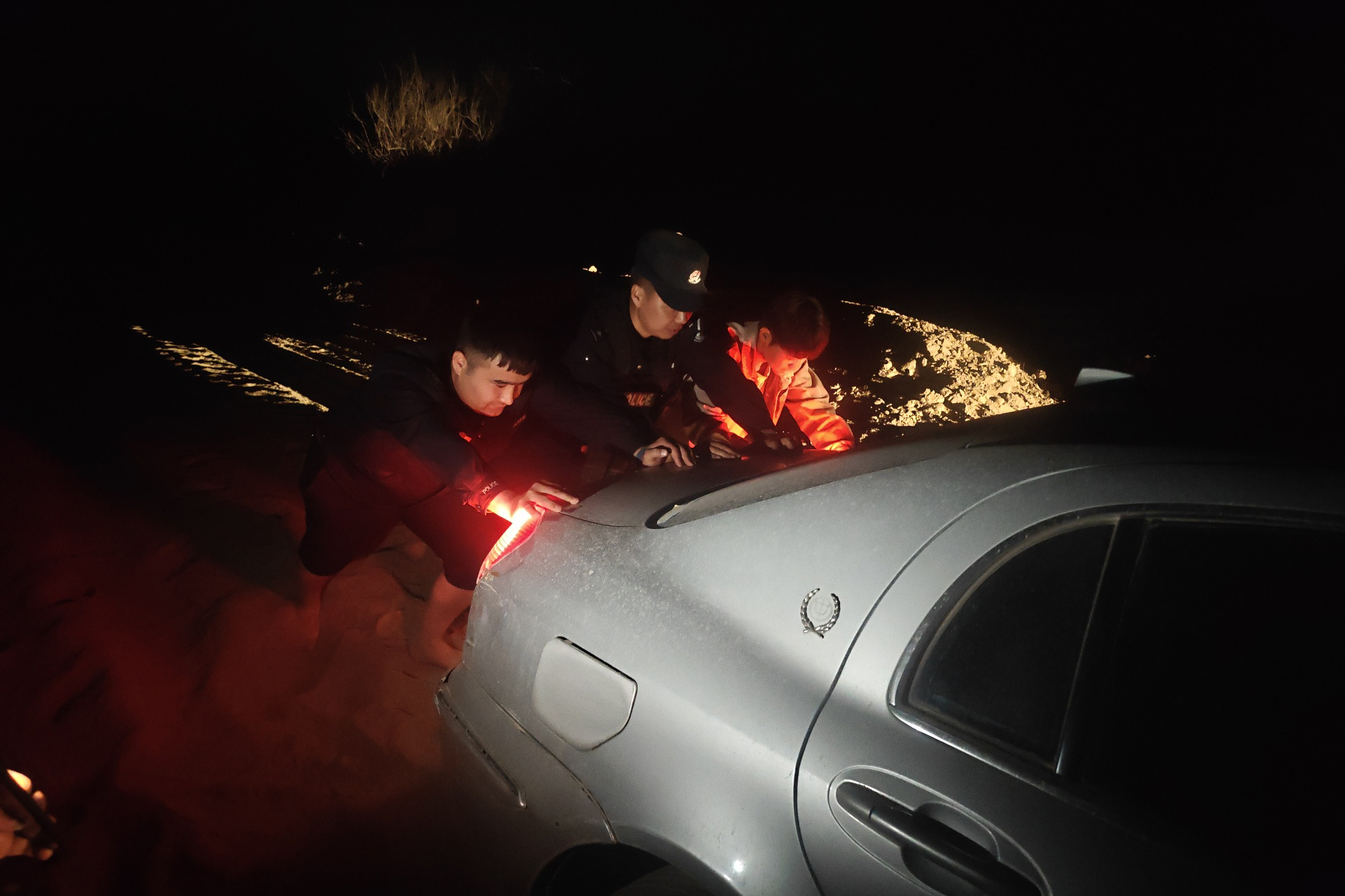 当晚,轮台县公安局群巴克镇派出所民警辅警艾克热木·托合提、拜合提亚尔·买买提像往常一样开展夜间巡逻。当行至西环路3.5公里处时,发现一辆车陷在戈壁滩的松软土路中间,车辆左前轮深陷泥土中,动弹不得。