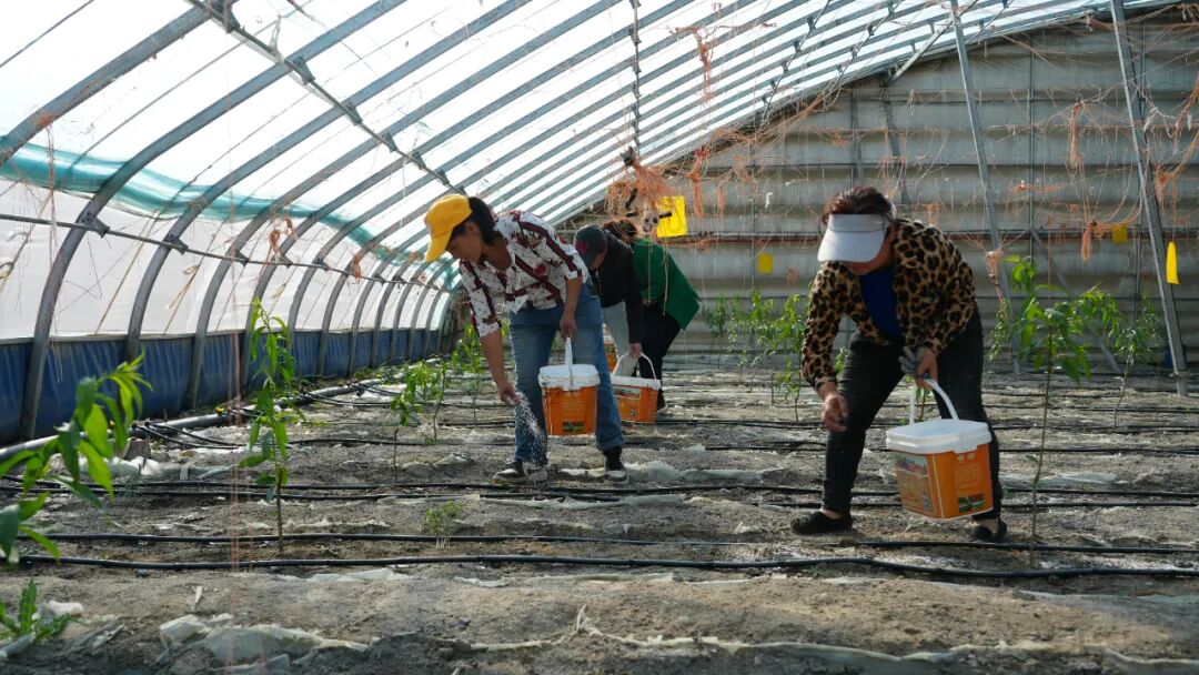 4月15日,在若羌县铁干里克镇努尔巴格村的盛世羌农设施农业种植基地,一座座高标准温室大棚在阳光下熠熠生辉,工人们正为大棚里的桃树整枝打杈、施肥浇水,一片忙碌景象。