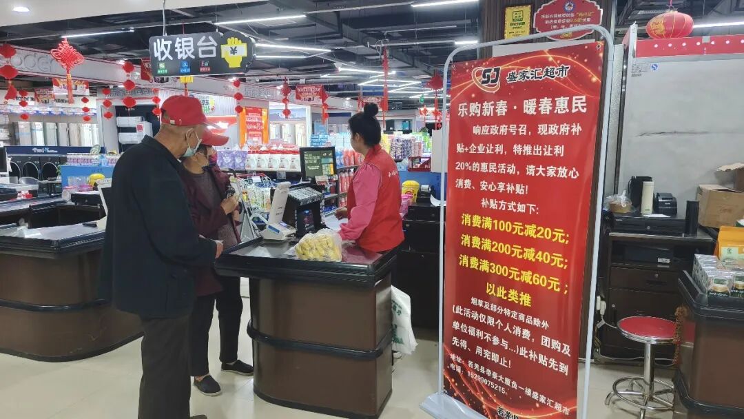 4月14日,记者走进县城盛家汇超市看到,前来采购购物的群众络绎不绝,各大商超纷纷推出惠民让利促销举措。本次消费补贴采用现场直接立减模式,群众单笔消费满100元即可享受八折优惠,按照满100减20、满200减40、满300减60的标准进行阶梯减免,优惠上不封顶、多买多减。