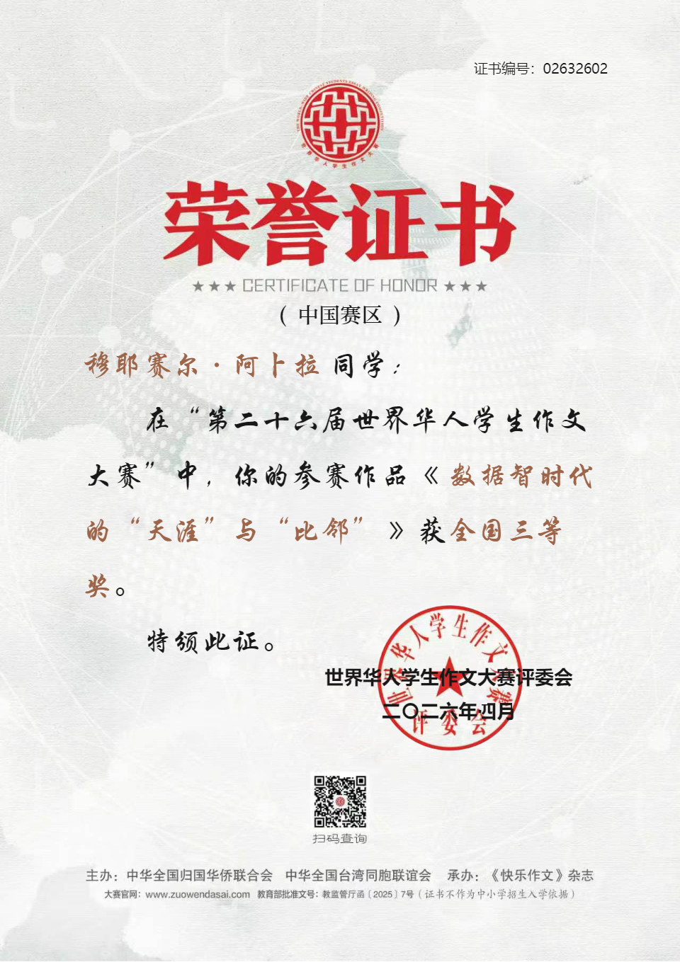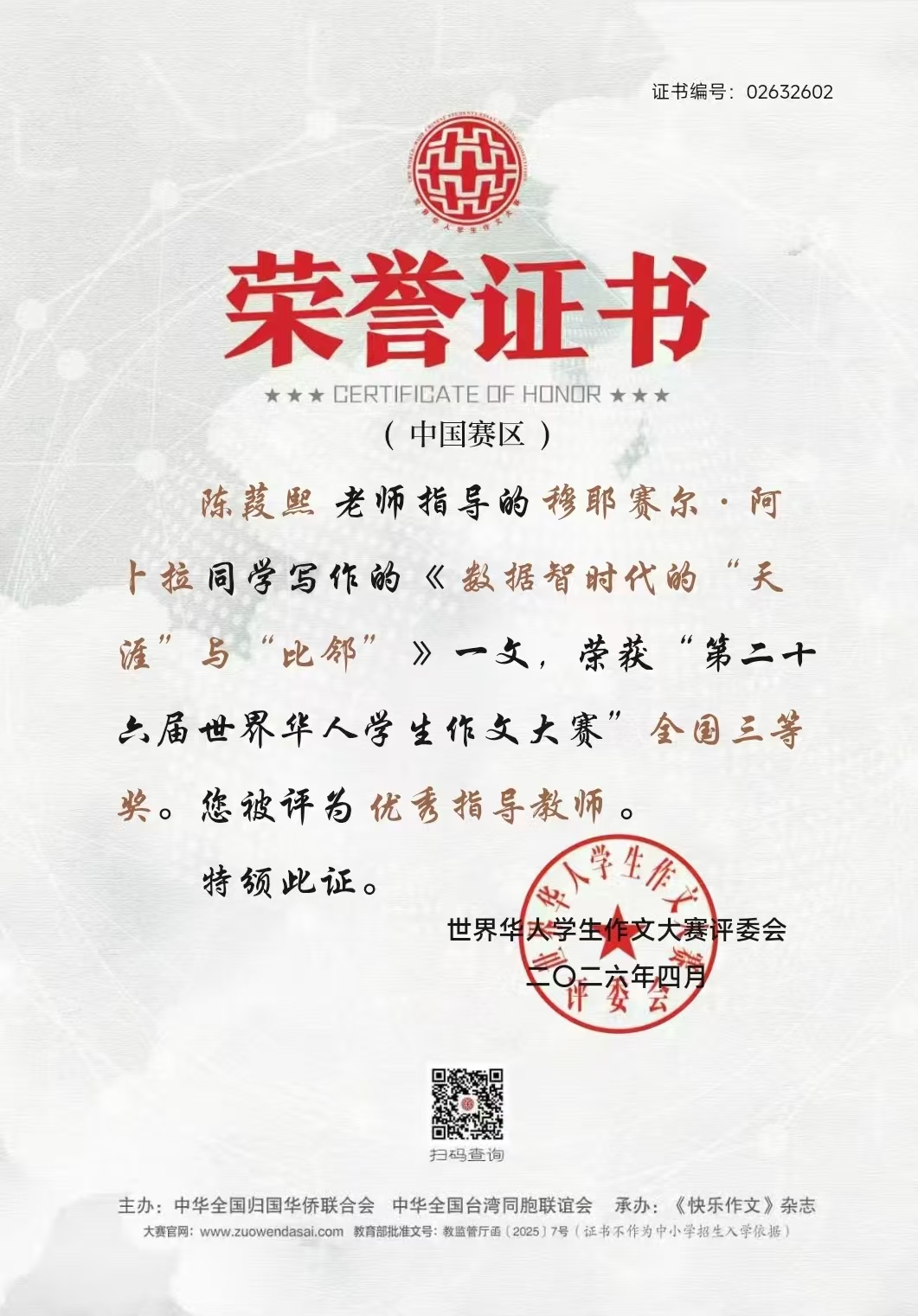 近日,第二十六届世界华人学生作文大赛获奖名单公布,该校高一10班学生、16岁的穆耶赛尔凭借作品《数据智时代的“天涯”与“比邻”》荣获全国三等奖,陈葭熙获评优秀指导教师奖。