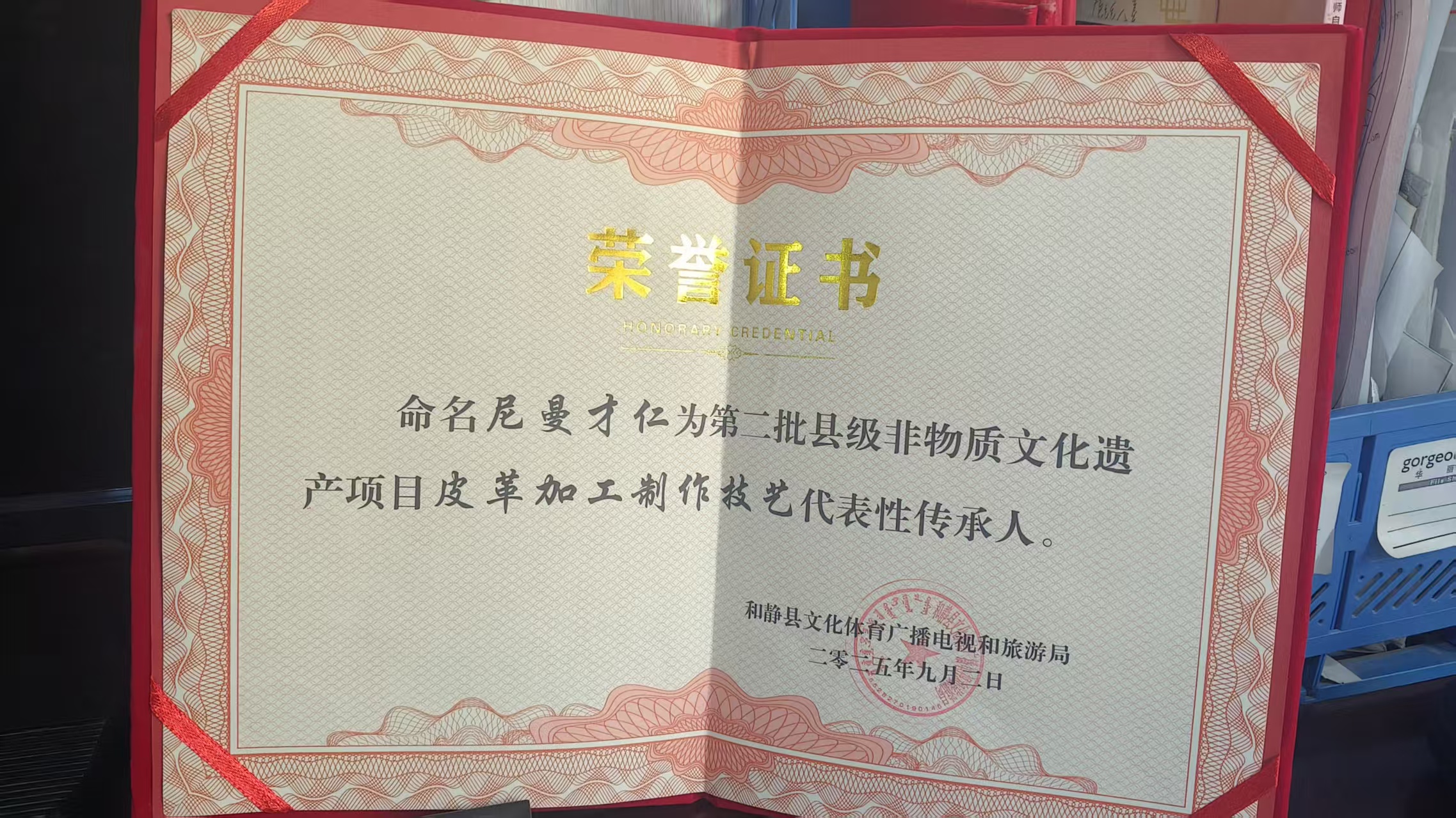 2025年,尼曼才仁正式入选和静县第二批县级非物质文化遗产项目“皮革加工制作技艺”代表性传承人,这份认可也让他肩上的传承使命更加坚定。